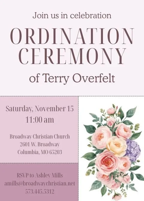 Terry has completed the requirements of our Commission on the Order of Ministry and will be ordained to the Church’s Ministry for Jesus Christ.