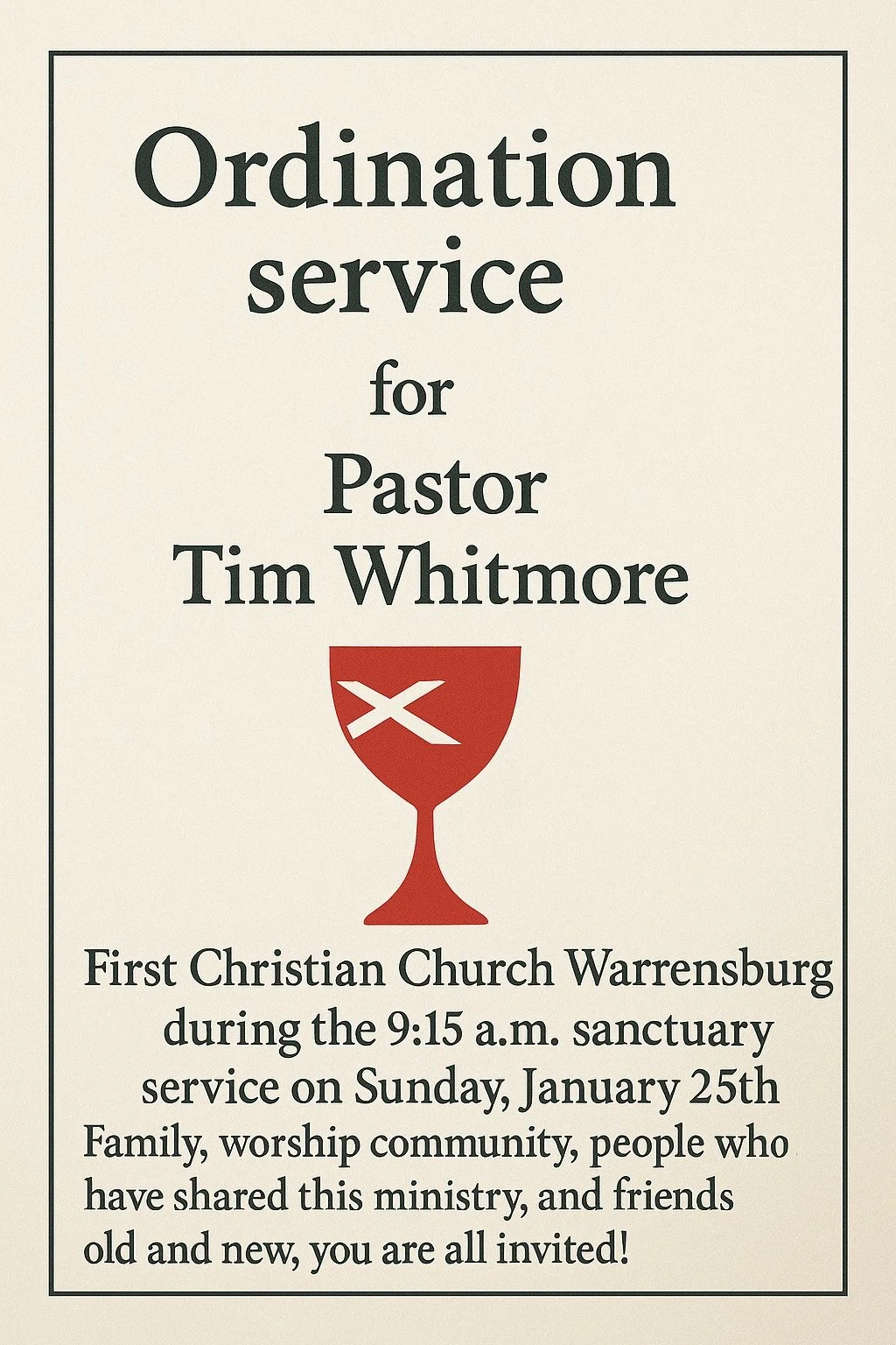 Pastor Tim Whitmore has completed the requirements of our Commission on the Order of Ministry and will be ordained to the Church’s Ministry for Jesus Christ.