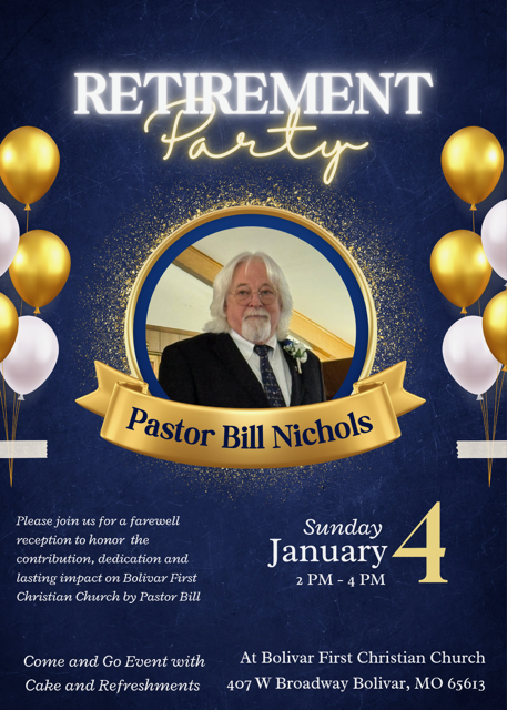 Bill Nichols, Pastor of the First Christian Church in Bolivar Missouri will be retiring on January 1st, 2026. Pastor Nichols was ordained at Granite Hills Christian Church in El Cajon California in June of 1983 and began his first full time ministry at the First Christian Church in Walnut Grove Missouri in July of 1985 where he served 22 years. He served the Gateway Christian Church in Springfield Missouri from 2008 - 2013 and has been the Pastor of First Christian Church in Bolivar since June of 2013. You are invited to attend a reception for Pastor Nichols on Sunday afternoon, January 4th.